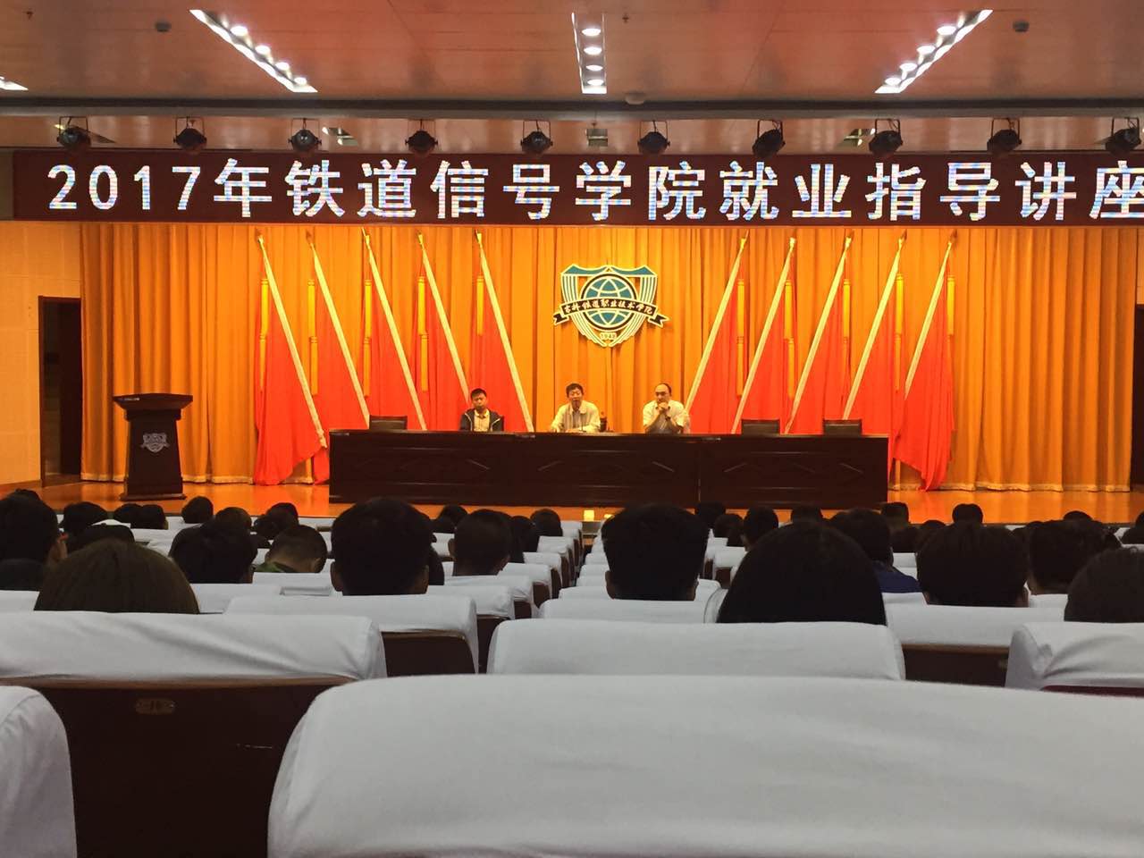 6月9日,铁道信号分院在图书馆报告厅举办就业指导讲座。讲座由中铁九局人力资源部副部长郭怀忱主讲,党总支书记刘洪波、长白山技能名师莫建国、学办主任于威、部分无课教师以及2015级全体学生参加了本次讲座。讲座由莫建国老师主持。