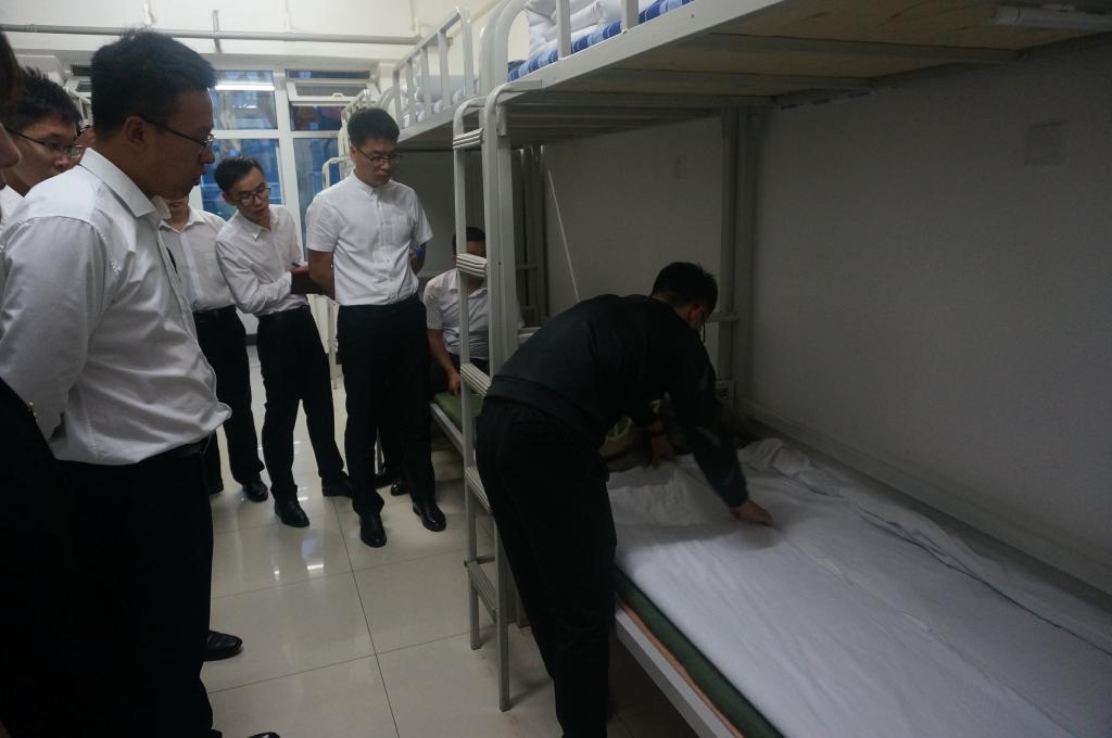 为使新生班主任明确学院公寓半军事化管理制度要求,提高对新生公寓内务整理的指导教育水平,做好新生入学教育。铁道车辆分院于2018年9月1日18:00,组织全体新生班主任深入学生公寓,进行公寓内务整理现场培训。由复转军人辅导员林志伟进行指导。