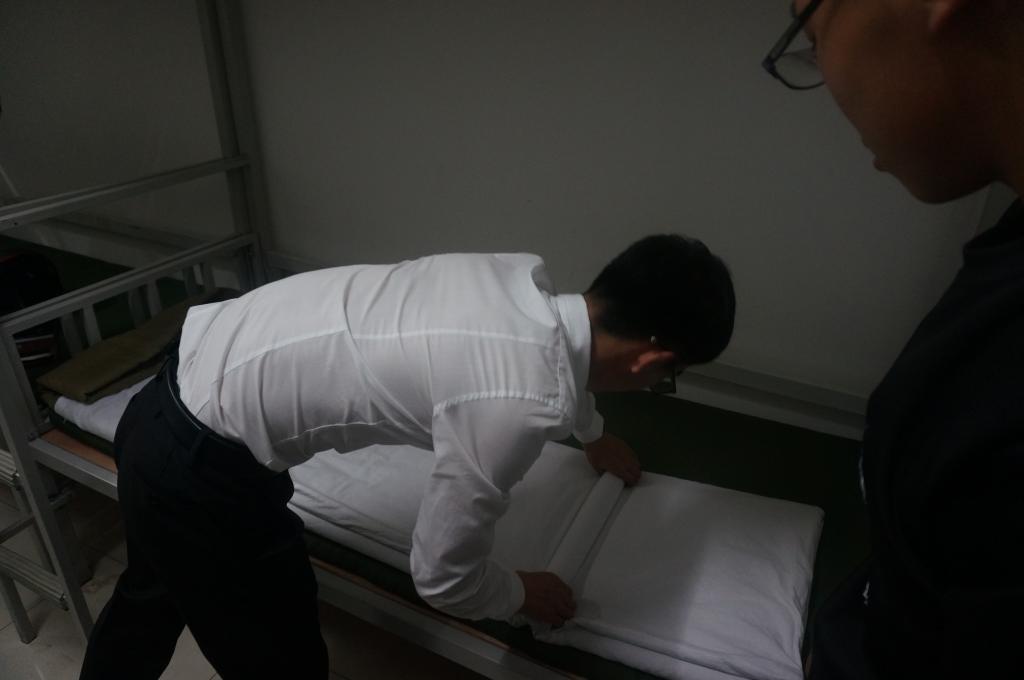 在培训过程中,林老师首先组织舍务部干事,对于公寓内各项物品摆放要求进行了详细讲解。林老师和参军入伍复学学生商博维分别为动检和车辆两个专业班主任老师演示叠被子教学,分解演示每一个步骤。经过“三分叠七分修”的工作之后,标准的军被便呈现在大家眼前。各位班主任学习以后,纷纷躬身亲为,动手练习。经过认真反复练习,一床床有棱有角的被子展现在面前,虽然和标准的军被相比还有所差距,但是班主任老师学习和练习的热情十分高涨。