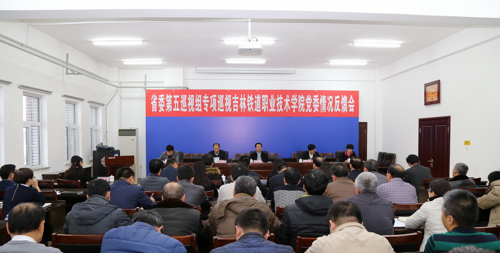 12月28日下午,吉林省委第五巡视组专项巡视吉林铁道职业技术学院党委情况反馈会,在学院办公楼五楼会议室召开。巡视组组长、正厅长级巡视专员刘继武同志,副组长、副厅长级巡视专员王忠华同志,副组长、正处长级巡视专员张强同志,成员、副处长级巡视专员贾淑春同志,副处级巡视专员赵庆斌、董学武同志,主任科员李飞同志出席会议。学院领导班子成员、中层干部和正高级专业技术职务教师以及民主党派负责人参加会议。会议由学院院长曹炳志同志主持会议。