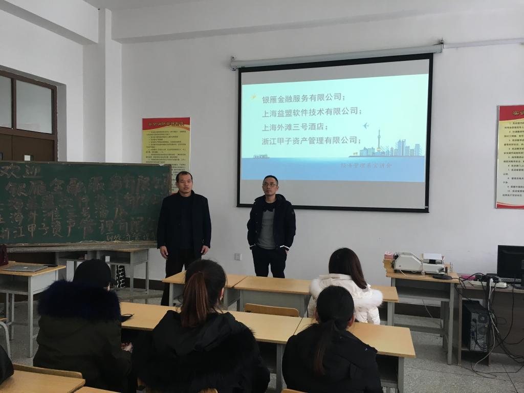 12月21日下午1时,上海银雁金融服务公司、上海益盟软件技术有限公司、上海外滩三号酒店在我院经济管理系实训楼504室举办毕业生招聘宣讲会。宣讲会由经济管理系党总支书记刘本基主持。2014级会计专业、财务管理专业、旅游管理专业的50名学生参加宣讲会。