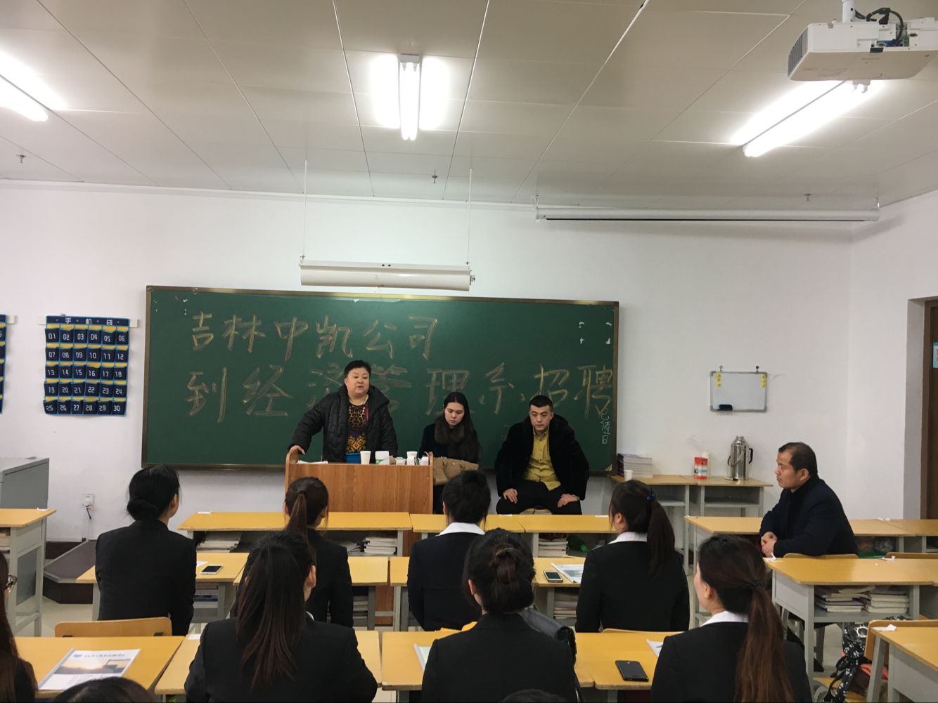 2016年12月19日13:00时,吉林中凯公司人力资源部孙婷总经理、卜经理等三人来到经济管理系招聘。招聘会在教学楼813教室举行,经济管理系党总支书记刘本基主持招聘会,经济管理系2014级有8名财务管理专业和会计专业学生参加面试。