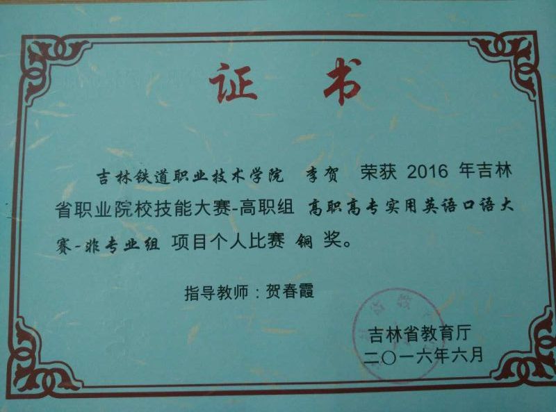 在2016年3月结束的吉林省职业院校技能大赛(高职组)高职高专实用英语口语大赛中,我院学生史林、李贺分别获得了专业组银奖、非专业组铜奖的好成绩。
