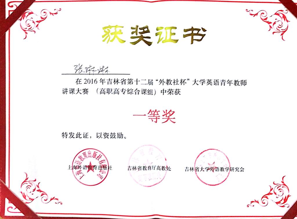 在刚刚结束的2016年第七届“外教社杯”吉林省第十二届大学英语青年教师讲课大赛中,我院基础部英语教研室张琳琳老师获高职高专综合课组一等奖。