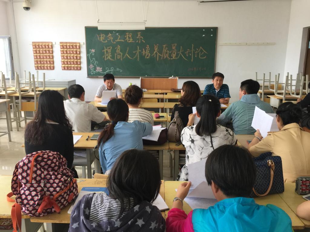 刘洪波书记首先强调了提高人才培养质量的重要性、学院确定开展“如何提高人才培养质量”大讨论的指导思想和活动内容。系副主任刘振波对开展本次人才培养质量大讨论提出具体要求。在讨论过程中,大家踊跃发言、气氛活跃、各抒己见。他们结合自身教学工作实际和学生实际,结合企业对电气工程系各专业毕业生的评价认可程度、存在的主要问题,就专业建设、课程建设、实训条件建设;教学组织运行管理、教学督导;体制机制即院系二级管理责权利;教师教学质量;相关部门教育管理;如何评价教学质量等方面的问题进行了广泛而深入地讨论,查摆问题,并提出意见和建议。