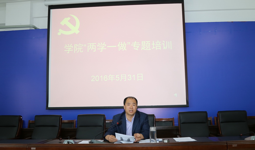 为落实学院“学党章党规、学系列讲话,做合格党员”学习教育实施方案要求,扎实推进学院“两学一做”学习教育工作,加强“两学一做”学习教育工作领导指导, 2016 年5月31日,学院开展“两学一做”学习教育专题培训。学院党委副书记曹炳志同志对各党总支书记、直属党支部书记、党支部书记、各党支部组织委员和宣传委员共计87人进行了“两学一做”学习教育专题培训。