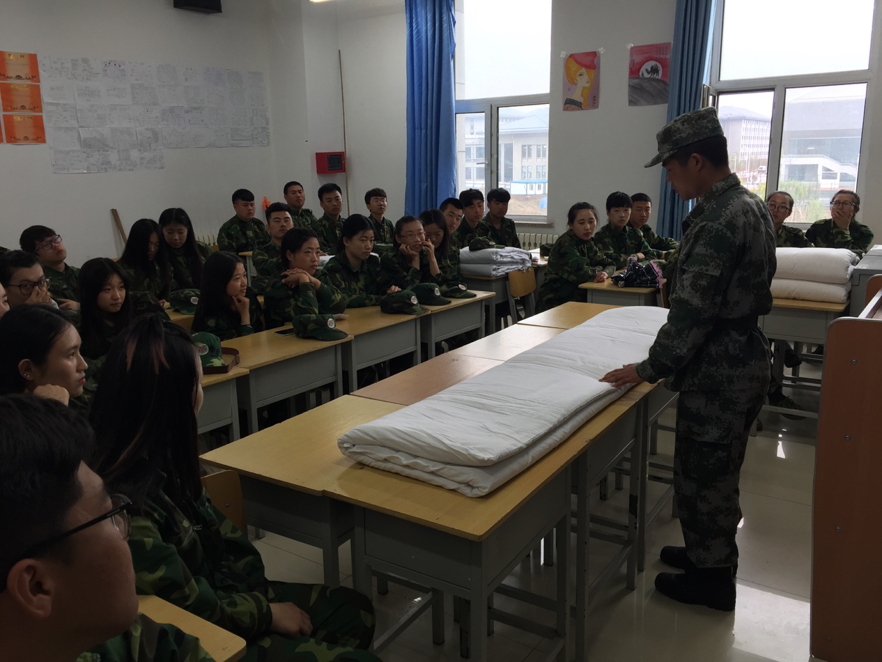 为强化新生军训规范意识,提升新生在军训期间的内务整洁程度,5月12日,教官们在铁道车辆系2015级各班教室向受训同学展示军被叠法。