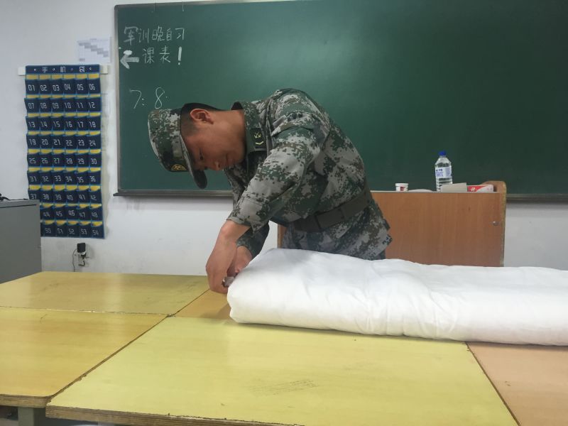 2016年5月12日早晨,在细细的小雨中,铁道运输系全体2015级学生开始了第四天的军训时光。由于天气原因,今日的训练地点改到了教学楼班级中。一改往日严格又艰苦的训练项目,今天主要的训练内容为内务学习,被子的叠法、军训服的整理以及唱军歌。