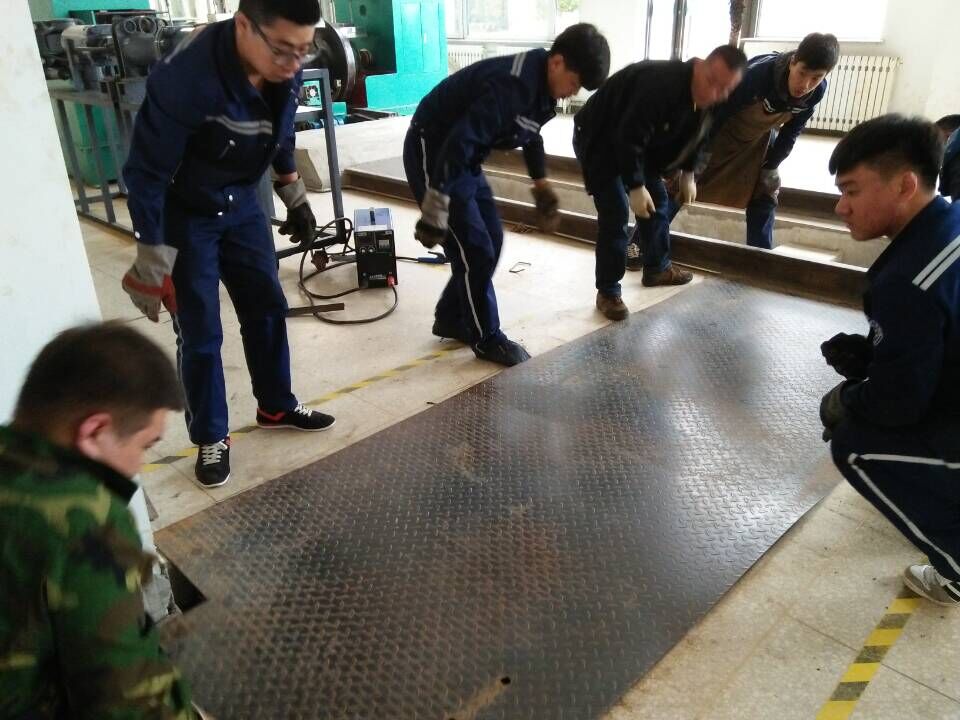 铁道车辆系所属的1号实训楼内地沟盖板因频繁教学使用导致松动,该安全隐患已影响学生正常实训。近日,在焊接技术与自动化专业教研室主任王贺龙的带领下,在铁道车辆系副主任关洪亮的指导下,2014级焊接技术与自动化专业韩笑、周琳、董鑫业、马飞云、毕天文等几位同学利用无课时间,自带电弧焊机和工具,将4块松动的盖板全部焊接牢固,消除了安全隐患。