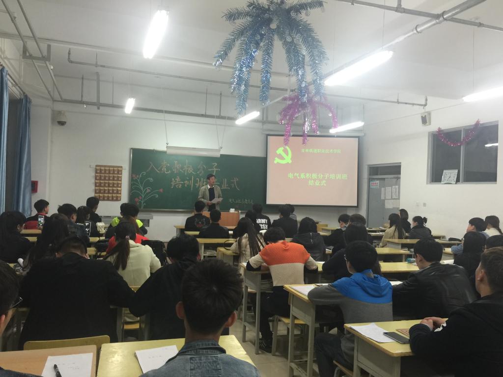 2016年5月4日晚自习时间,电气工程系党总支在教学楼607教室举行了2016年第一期入党积极分子培训班结业式。系党总支书记刘洪波、系团委书记徐薇和80名入党积极分子参加了结业式。至此,为期12天的入党积极分子培训工作圆满结束。