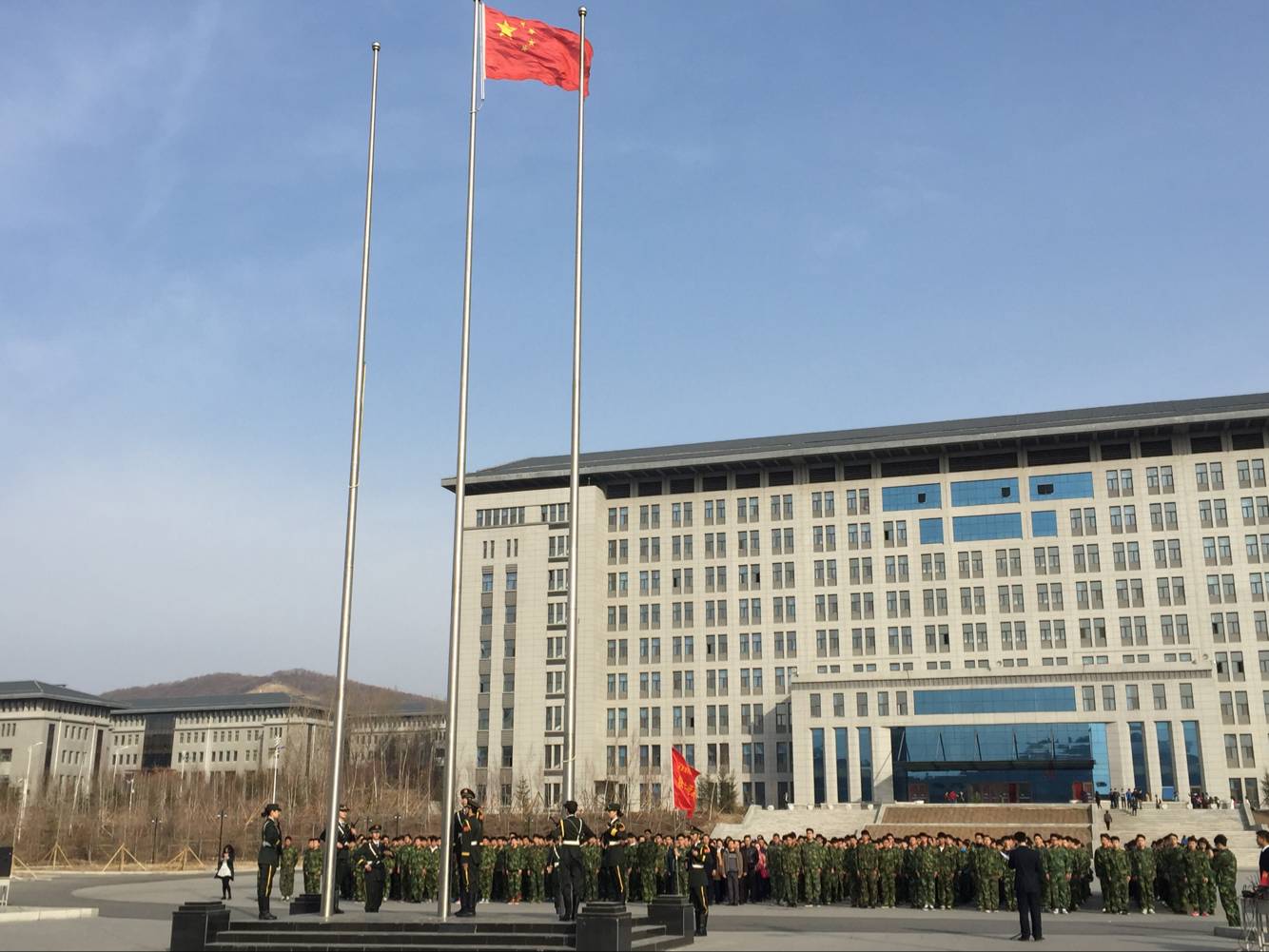 7:20,参加仪式的全体师生在教学楼前中心广场集合完毕。7:35,升旗仪式正式开始。伴随着庄严的国歌,五星红旗冉冉升起。全体师生高唱国歌,接受了一次爱国主义再教育,并为今日“富强、民主、文明、和谐”的伟大祖国而感到自豪。