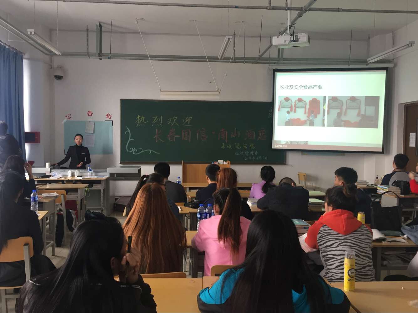 南山酒店的王红娟总监利用多媒体,形象地展示了长春国信集团南山酒店的航拍实景、员工工作环境、公司组成结构、集团管理模式和企业文化以及此次招聘的岗位和工资待遇等情况。通过现场问答与同学互动交流,学生积极勇跃,现场气氛热烈。