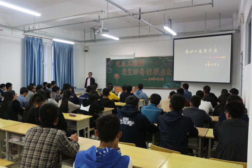 2015年10月15日晚,汽车工程系在教学楼709教室召开了老生回母校报告会。系党总支部书记王力群、辅导员老师王亚明及2014和2015级全体学生干部参加了会议。报告会由王亚明主持。