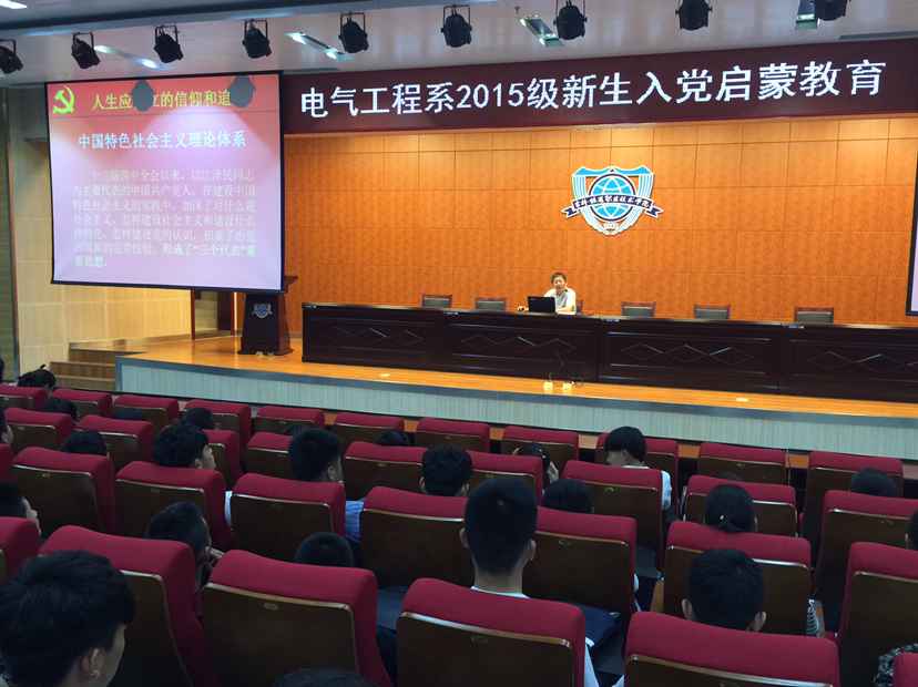 9月17日下午3:00,电气工程系在图书馆报告厅召开了2015级新生入党启蒙教育大会。系党总支书记刘洪波、学办主任金宇和团委书记徐薇出席大会并做辅导报告。