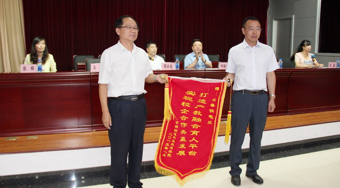 仪式上,学院领导向被聘为我院兼职教师的长春供电段马立祥等10名同志颁发了聘书;向在生产岗位表现突出的代泽鹏等17名优秀学员颁发了荣誉证书,优秀学员代表代泽鹏进行了发言;王华副院长代表学院向长春供电段赠送了书写着“打造产教融合育人平台,实现校企合作共赢发展”的锦旗;周云龙院长与何振生书记代表校企双方签署了校企合作协议。最后,周云龙院长与何振生书记分别发表了热情洋溢的讲话,为下一步双方在职教集团框架内,进一步深化校企合作,培养更多更好高素质技术技能型人才,指明了方向、奠定了基础、创造了条件。