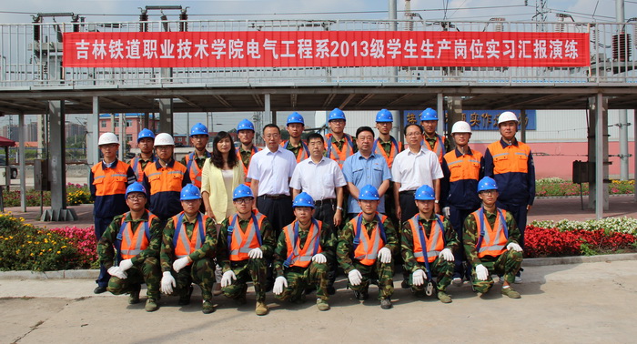 2015年8月31日,我院和沈阳铁路局长春供电段校企合作签约仪式暨2013级学生生产岗位实习结业典礼在长春供电段教育培训基地会议厅举行。与会领导有:长春供电段党委书记何振生、长春供电段副段长祝利江、教育科长武鑫,吉林铁道职业技术学院院长周云龙教授、副院长王华教授、电气工程系主任张辉教授。仪式由武鑫科长主持。
