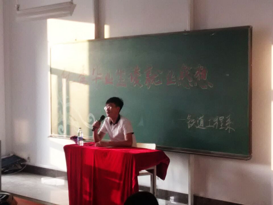 为了使广大在校生树立正确的就业观,铁道工程系于6月22日在教学楼西202教室,组织2015届优秀毕业生、原系学生会主席、高速铁道技术3121班的代印鑫同学就个人成长和就业经验做汇报讲座。系辅导员蔡丽梅主持讲座。系2013级全体学生参加讲座。
