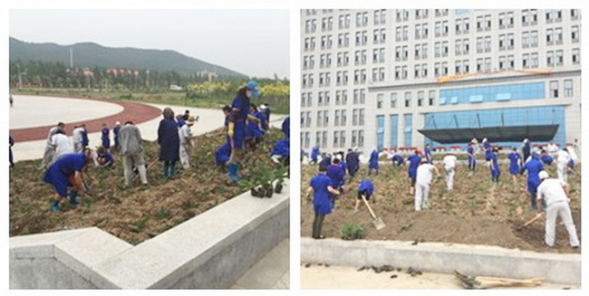 2015年6月25日上午,为美化校园环境,迎接建党94周年,由后勤与资产管理处张兴志处长带队,组织30余名绿化工作人员为教学楼门前花池种植花卉,共计栽种美人蕉1500棵。