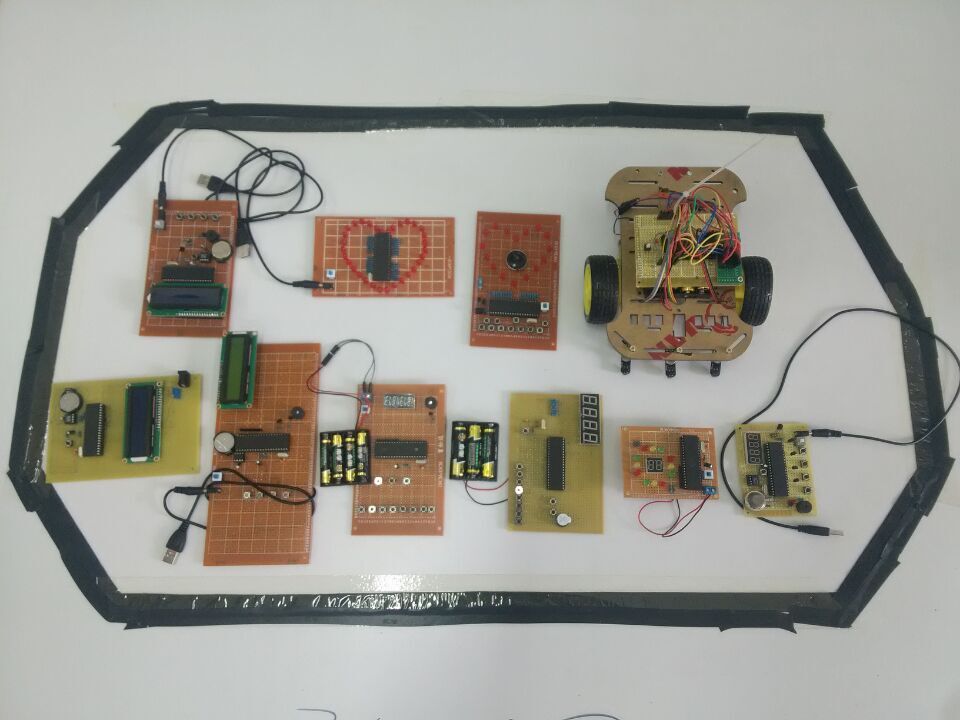 来自2014级共四个专业的电子兴趣小组成员,在陈冬鹤老师的精心指导下,经过初赛、预赛后,共有10组选手共30名同学进入到总决赛。10组选手分别完成了烟雾报警器、花样流水灯、定时万年历、循迹小车、8人抢答器等电子产品的设计与制作。评委老师们根据评分标准,对各组进行了公平公正地打分,最后评选出一等奖1组,二等奖2组,三等奖4组,优秀奖3组。