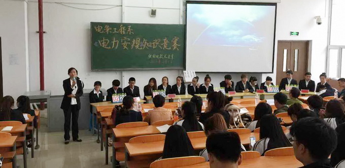 为加深学生对专业了解和对就业从事工作岗位的认识,以及强化规范操作和安全意识,电气工程系于2015年6月5日13:00在教学楼阶梯东402举办了由供用电技术专业主办的第三届《电力管理规程、电力安全工作规程》知识竞赛决赛。系主任张辉、系党总支书记刘洪波、系办公室主任刘振波、电气工程系全体教师以及供用电技术专业全体学生观看了比赛。刘洪波书记为比赛致开幕词。
