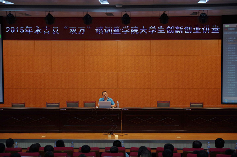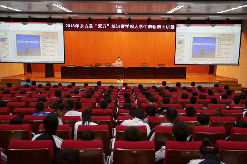 2015年6月1日15:00,铁道工程系学办主任于鹏带领70名学生到我院图书馆报告厅参加了由永吉县工信局、学院就业招生处和学院团委联合举办的“2015年永吉县双万培训暨铁道学院大学生创新创业讲堂”活动,共有三位讲师就创业扶持政策解读、个人创业经历、创业规划与股权融资三个方面给学生们带来了别开生面的一课。