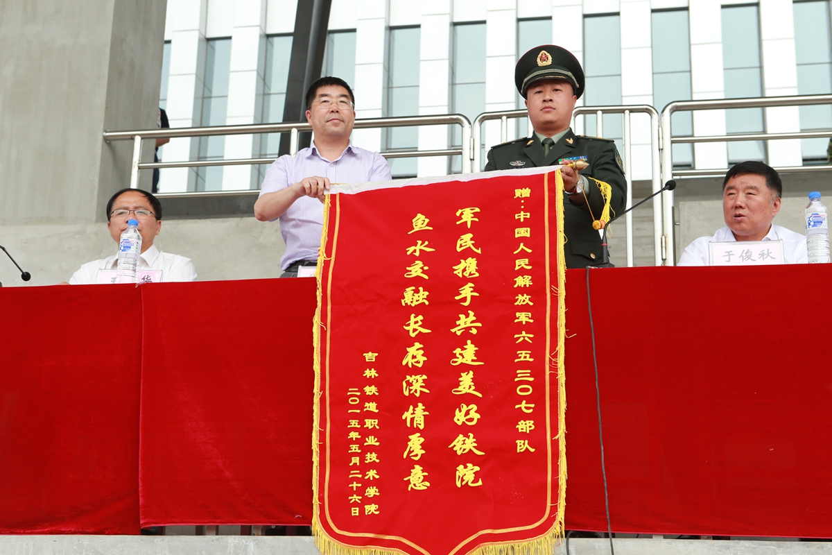 仪式上,周云龙院长代表学院向承训的65307部队赠送锦旗:鱼水交融长存深情厚谊 军民携手共建美好铁院,表达了我院师生对驻军65307部队全体承训官兵的谢意;学院党委副书记曹炳志发表讲话;学生工作部(武装部)副部长韩兵兵宣布了军训表彰决定;参加仪式的各级领导为获奖集体和优秀个人颁奖。
