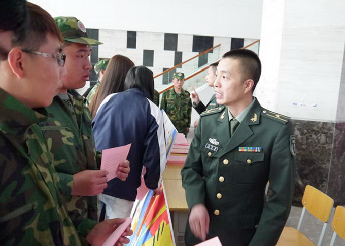 5月21日中午12:00,我院武装部在教学楼一楼大厅设立了学生征兵入伍咨询台,开展2015年征兵入伍现场宣讲咨询活动,解答大学生参军入伍的相关问题。永吉县人武部参谋杨博海、尚亮,干事常兴国和我院学生工作部(武装部)部长刘树全、副部长韩兵兵、高丽娴,干事刘晓佳及各系学工干部、部分老师等参加了咨询会。