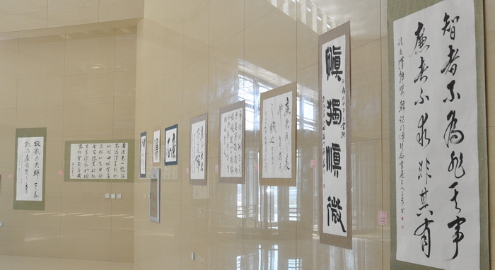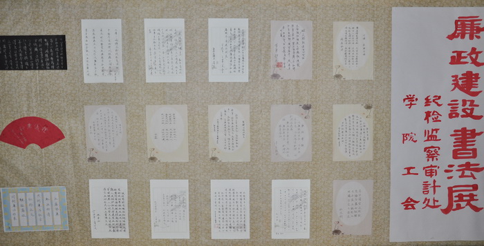 清风起笔端,正气贯天地。为了推动构建和谐校园,促进校园廉政文化建设,近日,学院工会、纪检监察处联合举办了教职工廉政建设书法展。本次书法展共展出各分工会遴选出的优秀作品 52 幅,所有作品紧扣反腐倡廉主题,风格、形式多样,行、楷、隶等书体一应俱全,有名言、警句、诗词等,内容丰富多彩。目前,书法展正在干培中心进行展览,吸引了众多师生驻足观赏。