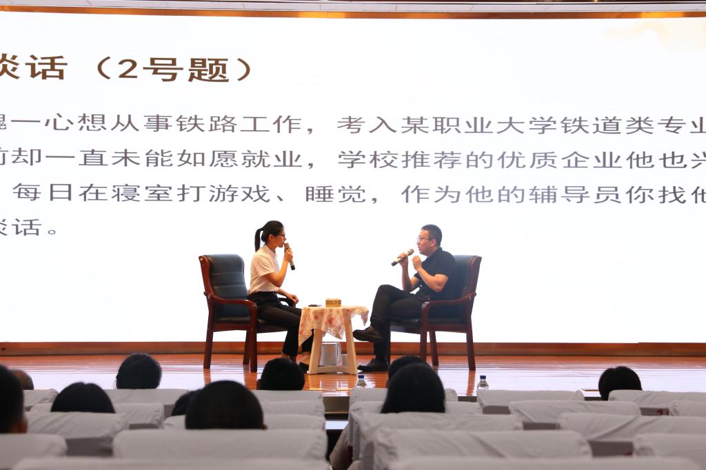 大赛分为初赛和决赛两个部分,在7月3日的初赛中,21名选手经过“理论及业务知识考查”与“案例分析”两个环节的激烈角逐,共有10名选手脱颖而出进入决赛。决赛共有两个环节,分别是“理论宣讲”和“谈心谈话”。在“理论宣讲”环节中,各位选手围绕习近平新时代中国特色社会主义思想、党的二十大精神、大学生理想信念教育、社会主义核心价值观等展开宣讲阐释。在“谈心谈话”环节中,各选手在对相关理论政策、学生特征、学生成长成才规律等充分了解把握的前提下,以情景再现的方式对学生进行教育引导。