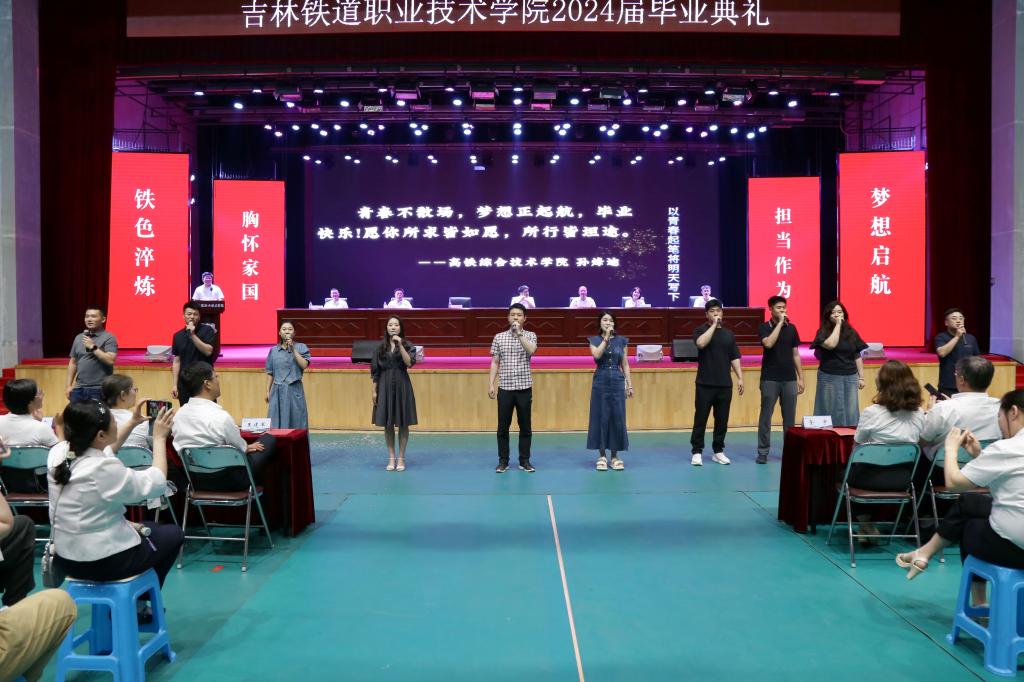 曹炳志回顾了2024届毕业生在学校三年生活的点滴精彩,细数了吉铁院学子在各个领域取得的成绩。他强调,三年来,同学们与校同心,携手同行,凝心聚力、勇毅前行,一同创造了诸多显著成就。双高建设有序推进、校区建设顺利实施、师资队伍增添动力、科研创新稳步增强、招生就业持续向好、产教融合深入拓展、国际合作再创佳绩、治理能力不断提高、平安稳定持续巩固、幸福铁院成色更足。在学校事业高质量发展的进程中,同学们既是见证者、亲历者,更是参与者、践行者。