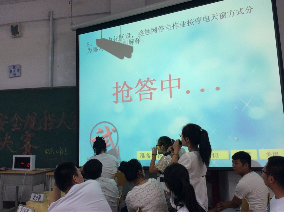 为强化电气化铁道技术专业学生对接触网安全操作规程知识的牢固掌握和理解,增强学生灵活运用知识的能力,让所学转化为所用,电气工程系于2014年6月26日13:00在教学楼东201教室举办了由电气化铁道技术专业主办的第二届《接触网安全规程》知识竞赛总决赛。系主任张辉、系党总支书记刘洪波、系全体教师以及电气化铁道技术专业全体学生观看了比赛。
