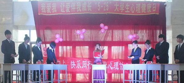以“我爱我 让爱伴我成长”为主题的大学生心理健康活动日暨心理活动成果展示于2014年5月22日下午4:30分在教学楼一楼大厅举行。此次活动得到学院党委副书记曹炳志及学生处、院团委和各系党总支书记、学办主任、团委书记的鼓励和支持。