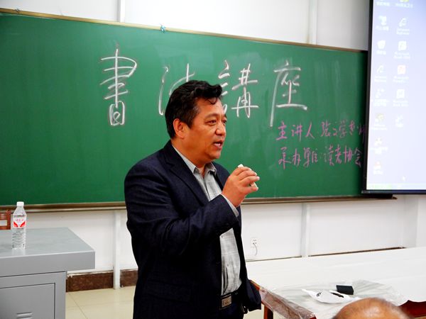 2014年3月16日下午,学院第二届“我的中国梦”书香铁院读书节书法讲座在教学楼东301教室举行,讲座特邀吉林市书法家协会资深书法教育专家张文学主讲。学院学生处全体老师、各系爱好书法的老师和学生共计200多人参加了书法讲座。讲座由学生处刘树全处长主持。
