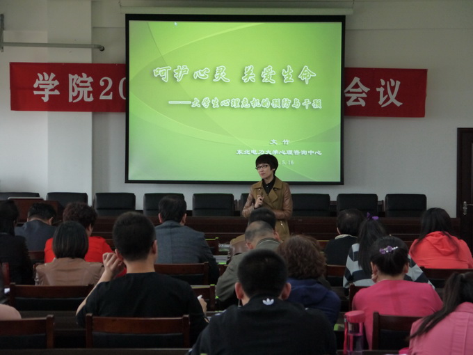以“呵护心灵 关爱生命”为主题的大学生心理危机干预培训会于2014年5月16日下午1点在办公楼五楼会议室举行。学院邀请东北电力大学心理咨询中心主任文竹老师进行培训,参加培训的有学生处全体工作人员以及各系学办主任、辅导员和班主任。