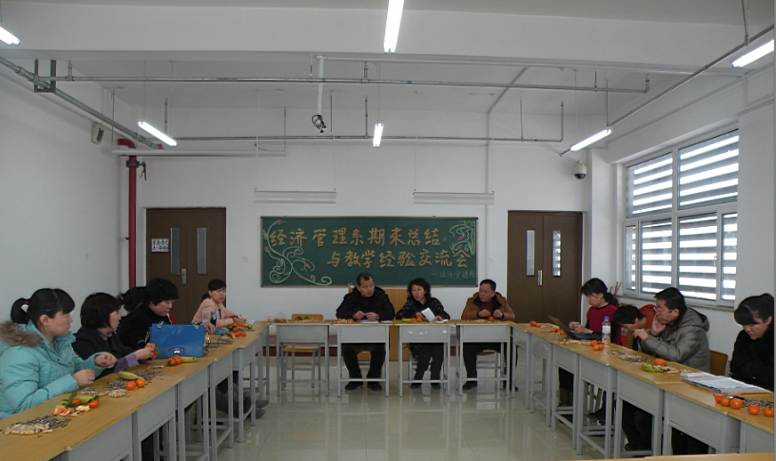 2014年1月14日下午,经济管理系在教学楼901室召开期末总结与教学经验交流会,会议总结了本学期的工作内容、部署了下学期的工作重点,并且组织全系教师就本学期的教学经验、教代会提案进行交流和讨论。
