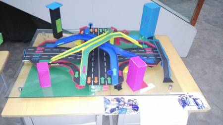 道桥3124班王鑫等同学设计的“儿时的梦想”主题模型 道桥3123班张洪禹等同学设计的半定向型立交桥模型
