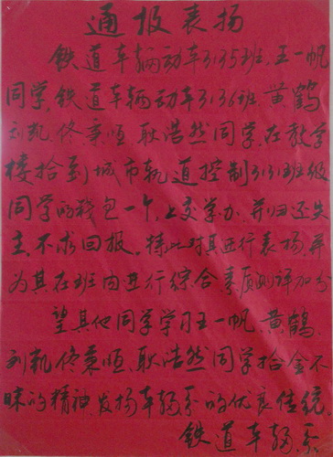 拾金不昧是中华民族的传统美德,也是一个人良好道德风尚和崇高社会责任感的具体体现。这几位同学们的行为充分体现了新时期大学生优良的道德品质和精神风貌,系领导经研究决定对他们给予通报表扬,并号召全系学生向他们学习,争做优秀大学生。