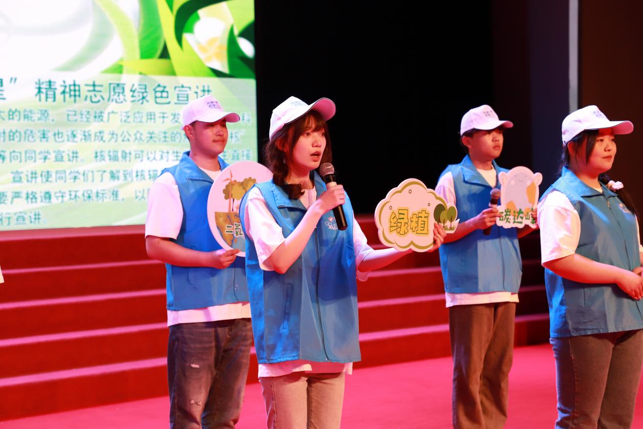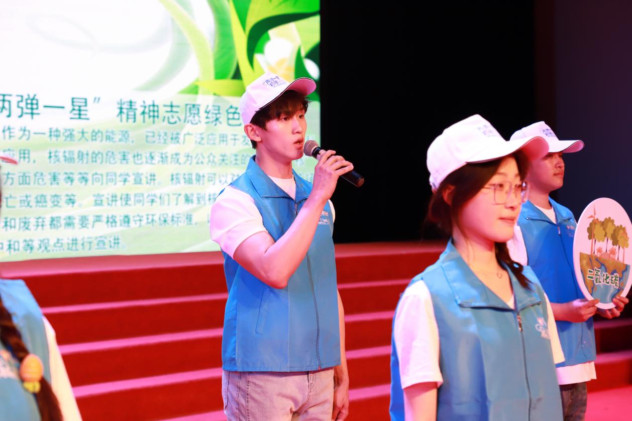 活动前期,学校通过线上线下相结合的形式,组织学生开展主题团课,组建“‘核’护万家”青年志愿服务宣讲团,推动专题宣传教育。通过“两弹一星”精神志愿绿色宣讲,为学生普及讲解能源、气候和生态的相关知识,聚焦绿色生产生活、碳达峰碳中和等重点领域,了解绿植在生态中的重要性的同时,也了解核辐射的多方面危害,并深刻认识到保护环境的重要性。