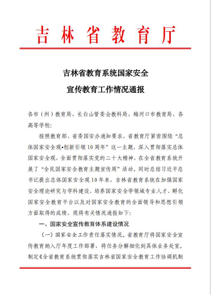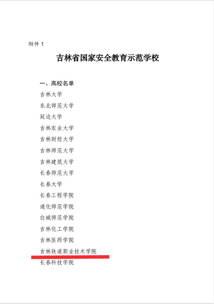 近日,省教育厅印发《吉林省教育系统国家安全宣传教育工作情况通报》,学院获评吉林省国家安全教育示范学校,是高职院校唯一一所获次殊荣的院校。