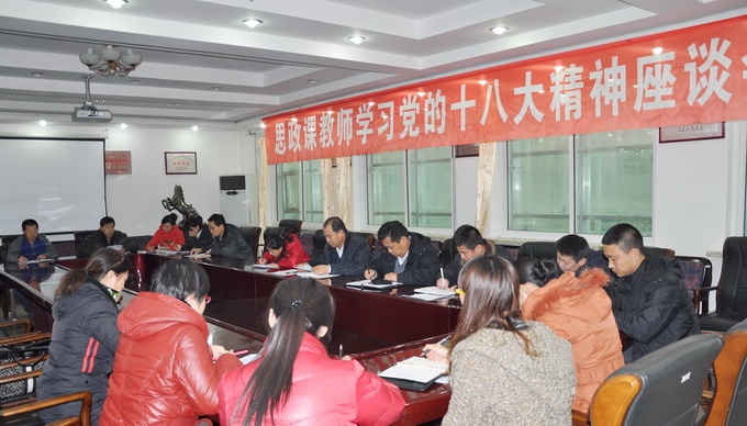 12月14日下午,思政课教师学习党的十八大精神专题座谈会在我院三楼会议室举行。学院党委副书记曹炳志、学生处处长刘树全、副处长韩兵兵同志出席座谈会。学院思想政治理论课教研部全体教师、兼职教师参加座谈会。会议由思想政治理论课教研部部长李晓平主持。