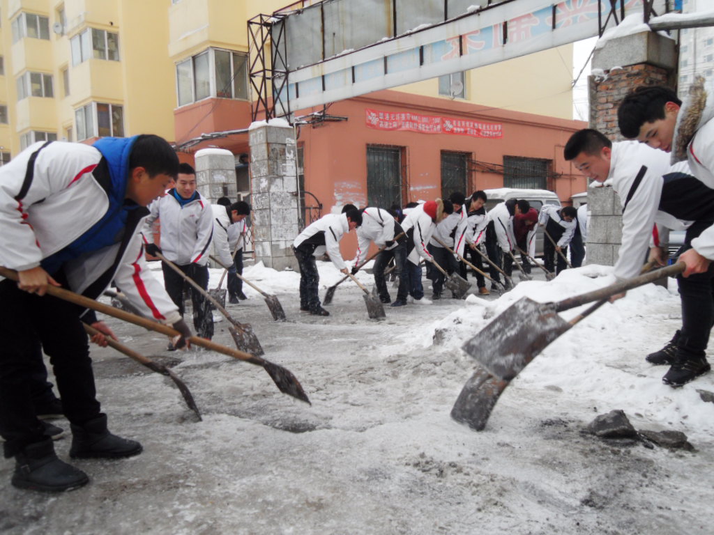 冒着严寒,76名党校学员对运河里社区两条主道路进行彻底清扫。他们用铁锹铲下光滑街道上的坚冰,清理好积雪,方便了人民生活,得到了社区领导和小区居民的好评。
