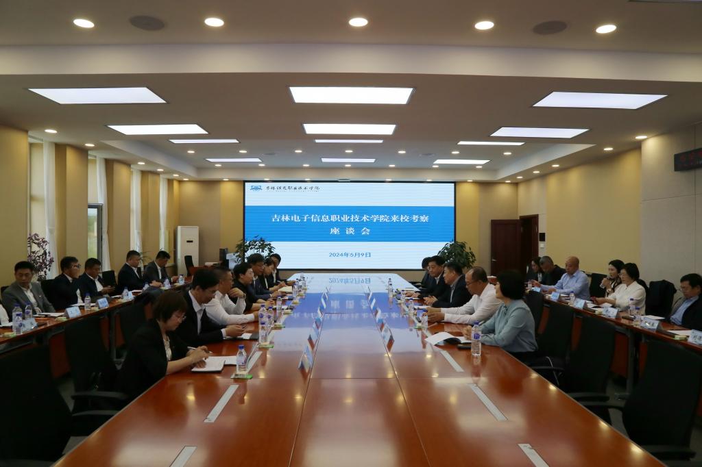 5月9日下午,吉林电子信息职业技术学院党委书记何晓杰,校长杨勇,党委副书记石洪发,纪委书记、监察专员高楠,副校长于钧,副校长刘占文,副校长张晓娟一行16人到我校考察调研。我校党委书记陈煜平,党委副书记、校长曹炳志,党委副书记苏建国,纪委书记、监察专员孙艳玲,副校长马卫强,相关部门负责人参加考察调研座谈会。