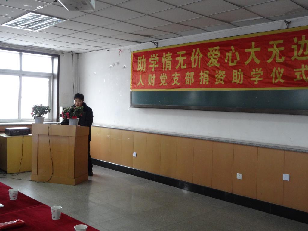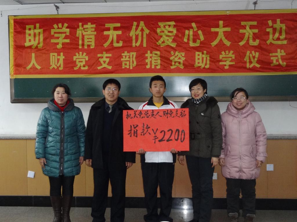 2011年12月23日下午2点,“机关党总支人财党支部捐资助学仪式”在东校区第一教学楼401合班教室举行。此次活动共捐款2500元(含学院工会主席李彦捐款300元),用来捐助机辆系来自宁夏边远山区的惠旭龙同学。捐助仪式由机辆系团委高丽娴书记主持。出席本仪式的有学院工会主席李彦,人财党支部书记、人事处处长王建军,人财党支部组织委员闫晶,宣传委员孟彬以及机辆系党总支书记张向力,系主任王学明,辅导员张强、李秀春等。