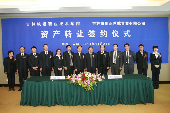 11月24日上午,吉林铁道职业技术学院与吉林市川正世城置业有限公司资产转让签约仪式在吉林市雾凇宾馆举行。出席仪式的领导和嘉宾有:吉林长春产权交易中心高级主管范学英、侯严贺;吉林铁道职业技术学院党委书记于俊秋、院长张炳南、党委副书记曹炳志、纪委书记王玉文、副院长王华、副院长王丽秋;天津市川正投资公司董事长、吉林市川正世城置业有限公司法人代表贾广胜,天津市川正投资公司独立董事周化龙、常务副总经理刘兰津,天津市川正投资公司吉林市分公司总经理魏锡友、投资总监薛士启。吉林铁道职业技术学院教学、学生、后勤、机关等单位和部门的中层干部,吉林市川正世城置业有限公司副总经理王晓峰、范志勇、江勇及有关工作人员也参加了仪式。签字仪式由学院党委副书记曹炳志主持。