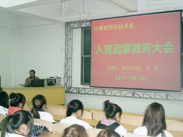 10月11日晚6:30时,计算机科学技术系在东校区西院第三教学楼3602室召开了2011级新生入党启蒙教育大会。大会由系党总支书记尹平主持。