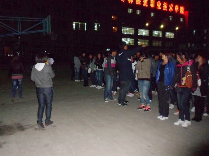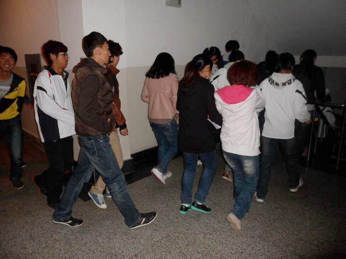 晚上6点55分演习开始,随着一声哨响,同学们立刻紧张有序地沿着逃生路线撤离,并用袖口或手绢捂住口鼻,弯着腰撤出教学楼,到达指定的安全地点——三教前的操场。迅速清点人数后,四百多名学生仅用了1分51秒就完成了安全撤离。