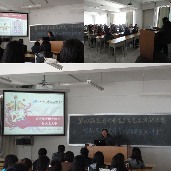 四月初始,由多媒体教研室主任吕刚、孟静、杨俊志和于藕等四位老师组成了第四届全国大学生广告艺术设计大赛(简称“大广赛”)宣讲团队,一方面经常研究商讨大广赛的细则,对大广赛赛况进行全面具体分析;一方面向电脑艺术设计专业的学生们进行大广赛的宣传动员,对同学们作品的给予专项指导。