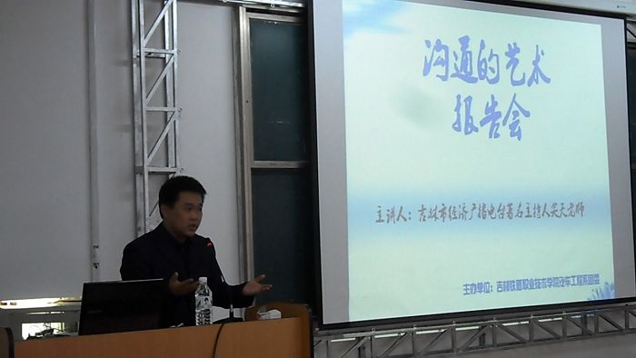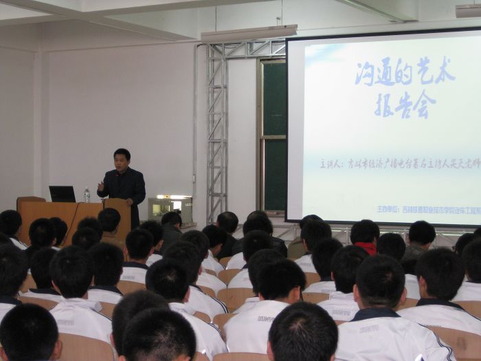 目前,如何适应社会,“沟通”已经越来越受大家的关注。因为它不仅关系到日常生活,而且在潜意识中影响着学生未来的就业。作为当代大学生,渴望获得更多知识,希望利用在大学时光提高自己的沟通能力,创造自己美好的未来。2011年4月22日16时,针对大二学生即将上岗实习就业的情况,应汽车工程系团委的邀请,吉林市经济广播电台、都市110著名主持人笑天老师,在我院东区西院综合楼3602教室举办了一场以“沟通的艺术”为主题的报告会。学院团委书记盛继前、系党总支书记王力群、系团委书记刘佳佳、系办公室主任孙志刚、实训基地主任黄延刚、汽车检测教研室主任董大伟以及全体班主任老师出席了本次报告会,大二同学和学生会干部参加了报告会。