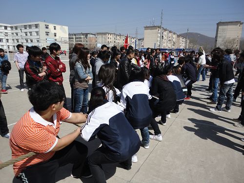 活动共分为两项——跳绳、拔河比赛,8个班参加角逐。首先进行的是跳绳比赛,每个班由两名学生负责摇绳,每班级各10名学生参与跳绳,比赛过程中学生的欢笑声,数数声,叫好声不绝于耳,所有人都被这快乐的气氛所感染,连老师们都跃跃欲试,参与其中。看,拔河比赛开始了,随着体育部长的一声哨响,参赛的同学个个压低重心,卯足了劲儿,憋红了脸儿,心往一起想,劲往一起使,班主任站在队伍前边有节奏的挥舞着手中的小旗,呐喊加油。比赛悬念迭起,绳子一会来回拉锯,一会僵持在中间,一会又偏向了另一方,全体同学都成了拉拉队员,欢呼跳跃着加油助威,呐喊声震耳欲聋,场面热闹非凡。
