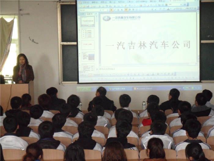 10月25日汽车工程系又传就业佳报,一汽集团吉林汽车有限公司根据需求,到我系进行企业宣讲并预订09级汽车制造、汽车电子、汽车检测、汽车营服专业学生顶岗实习。该公司人力资源部孔老师为同学们做了公司的专题介绍,人力资源部刘老师为同学们现场答疑。会后学生根据个人意愿填报实习生自然情况登记表,作为吉林汽车有限公司人力储备资源,在2010——2011学年课业完成后经面试到企业顶岗实习,毕业后可直接签订就业合同,继续在企业深造。